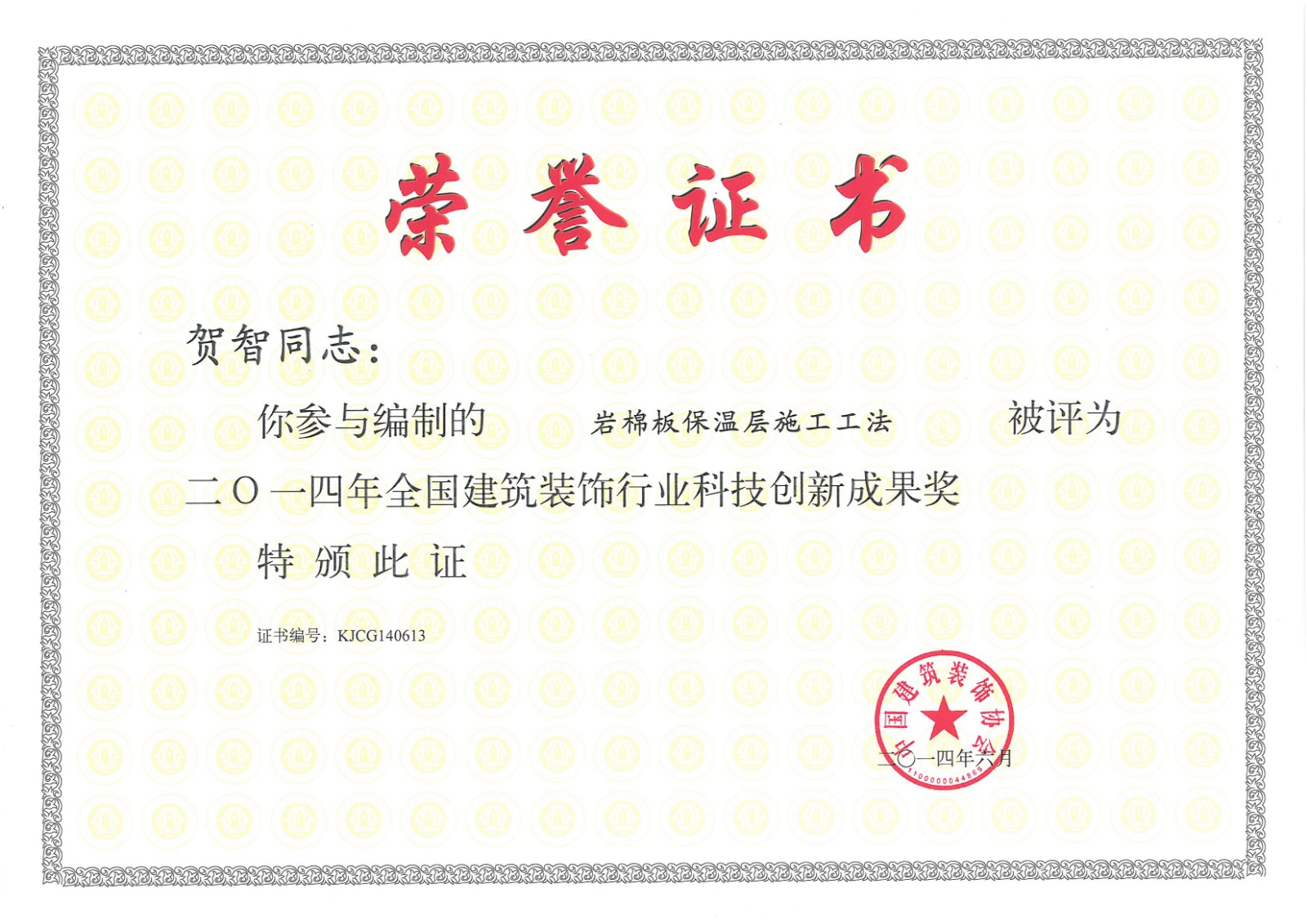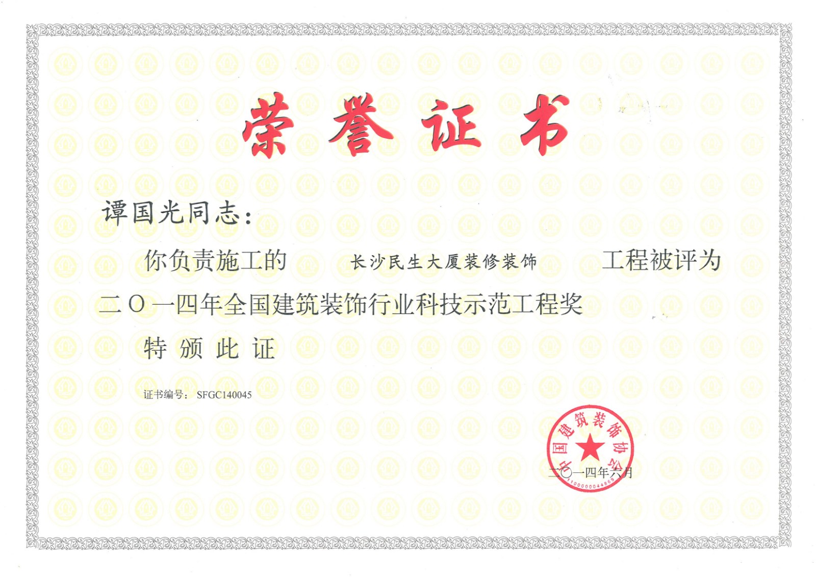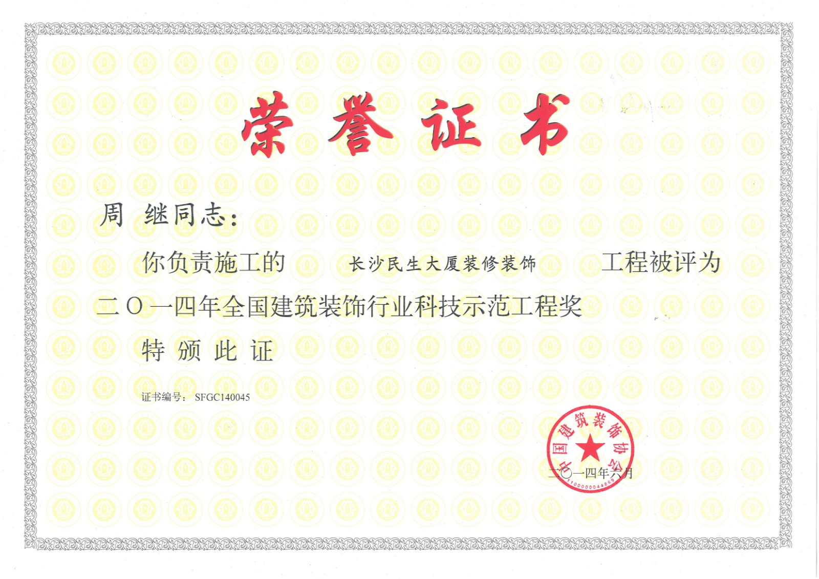 行業科技示范工程榮譽證書