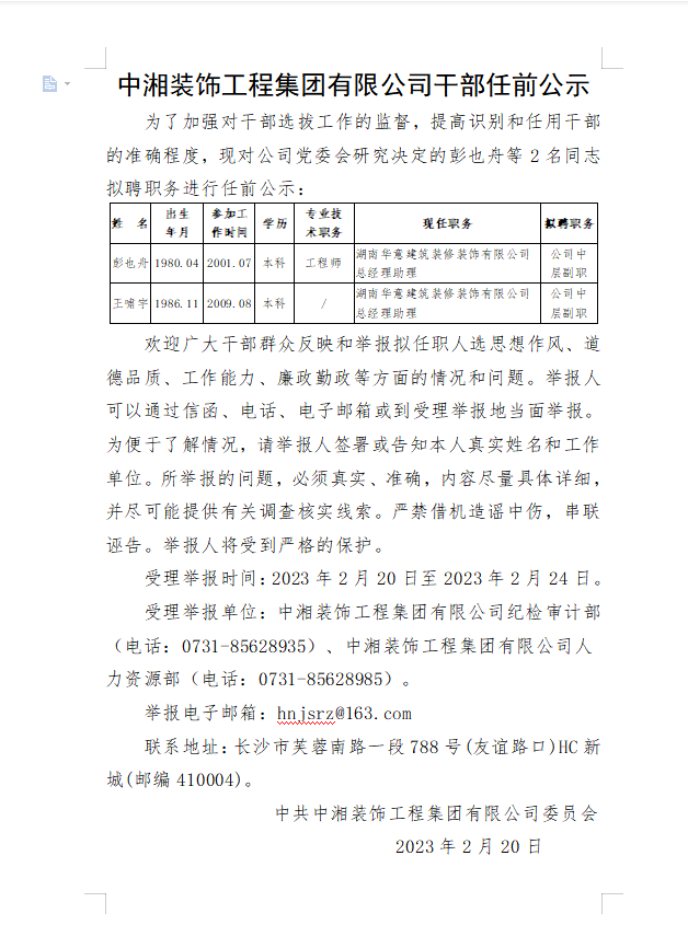中湘裝飾工程集團有限公司干部任前公示(彭也舟、王嘯宇)